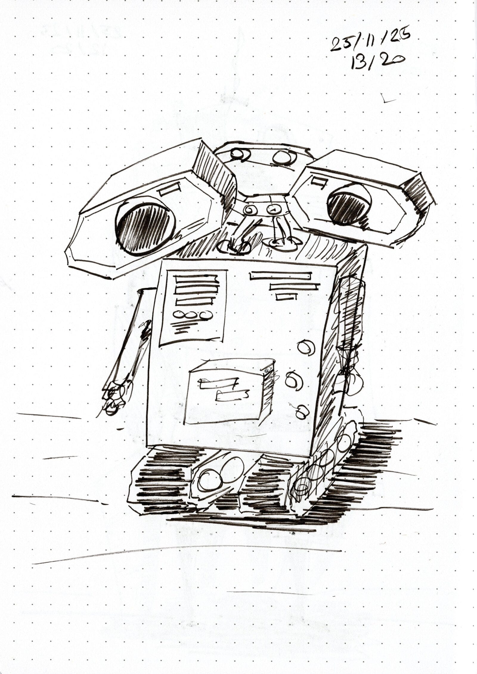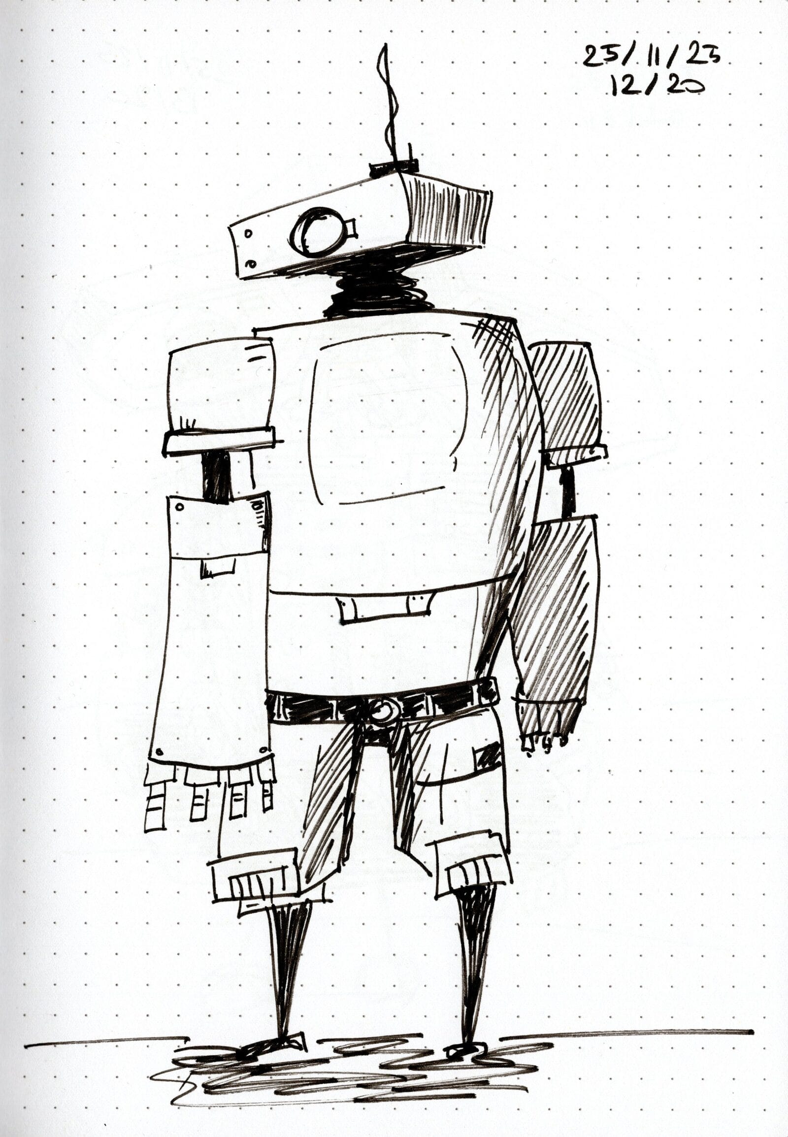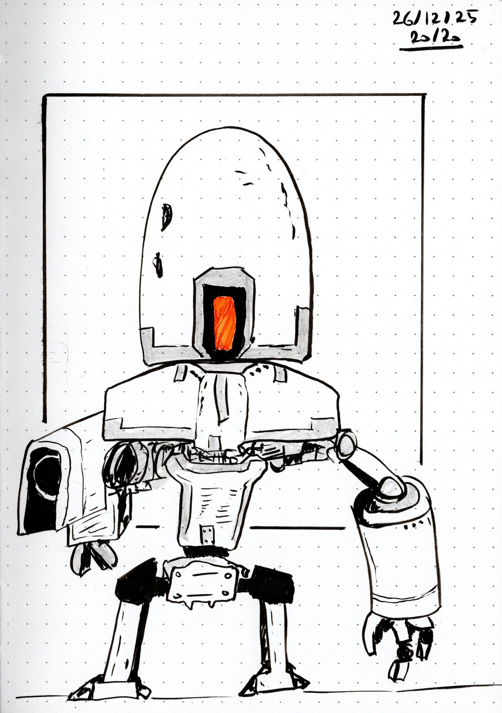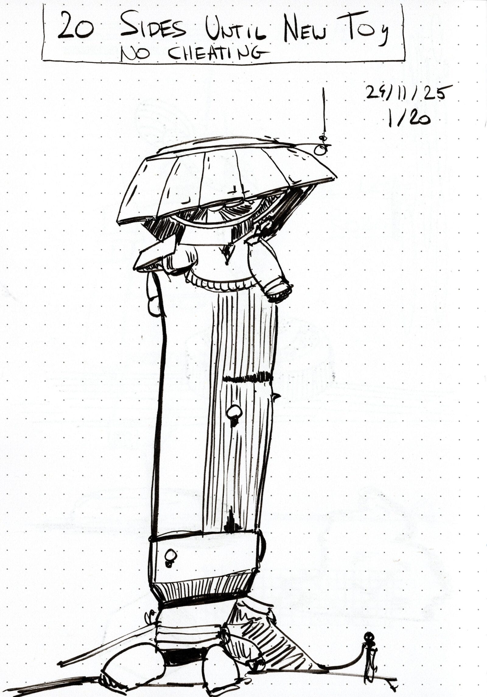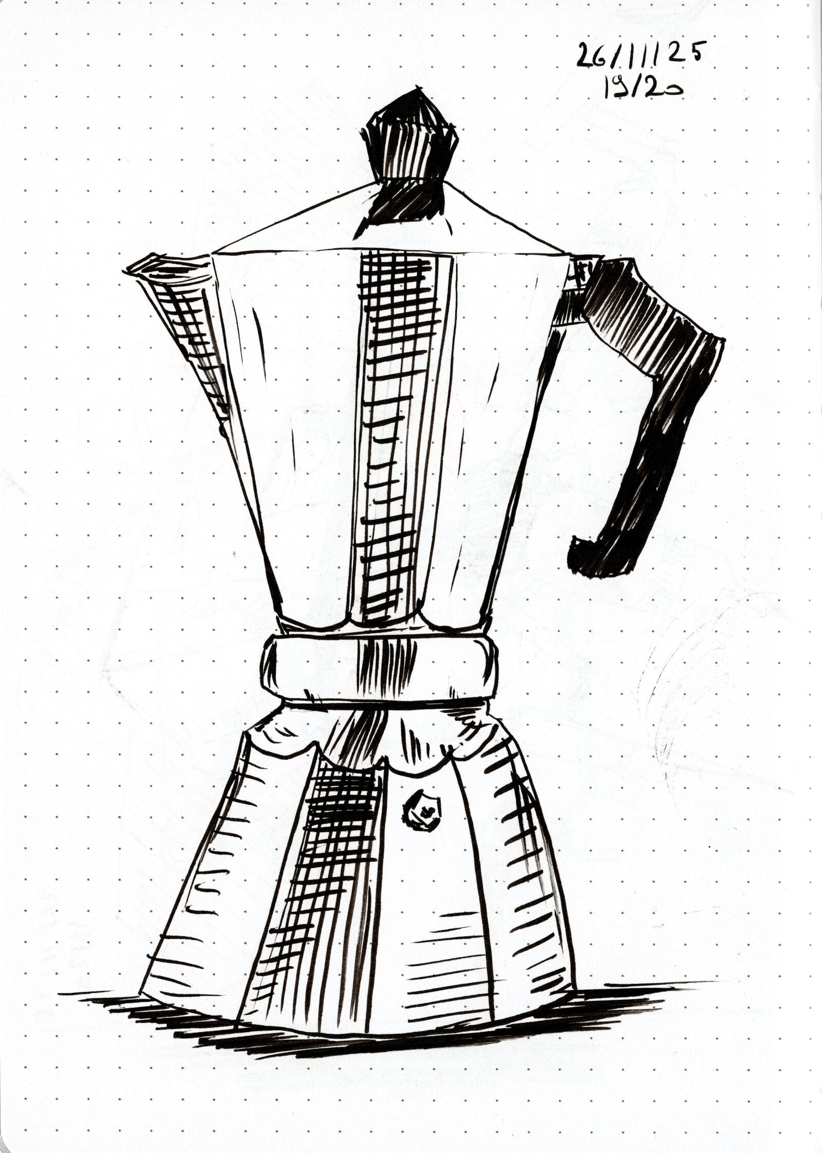 I set myself a challenge: 20 drawings with a Tombow Fudenosuke before I could buy the Pentel Pocket Brush. Three days later, I’d drawn mechs, rockets, and a hyperspace barista—cheered on by a hallucinating AI. Challenge done. New pen unlocked.