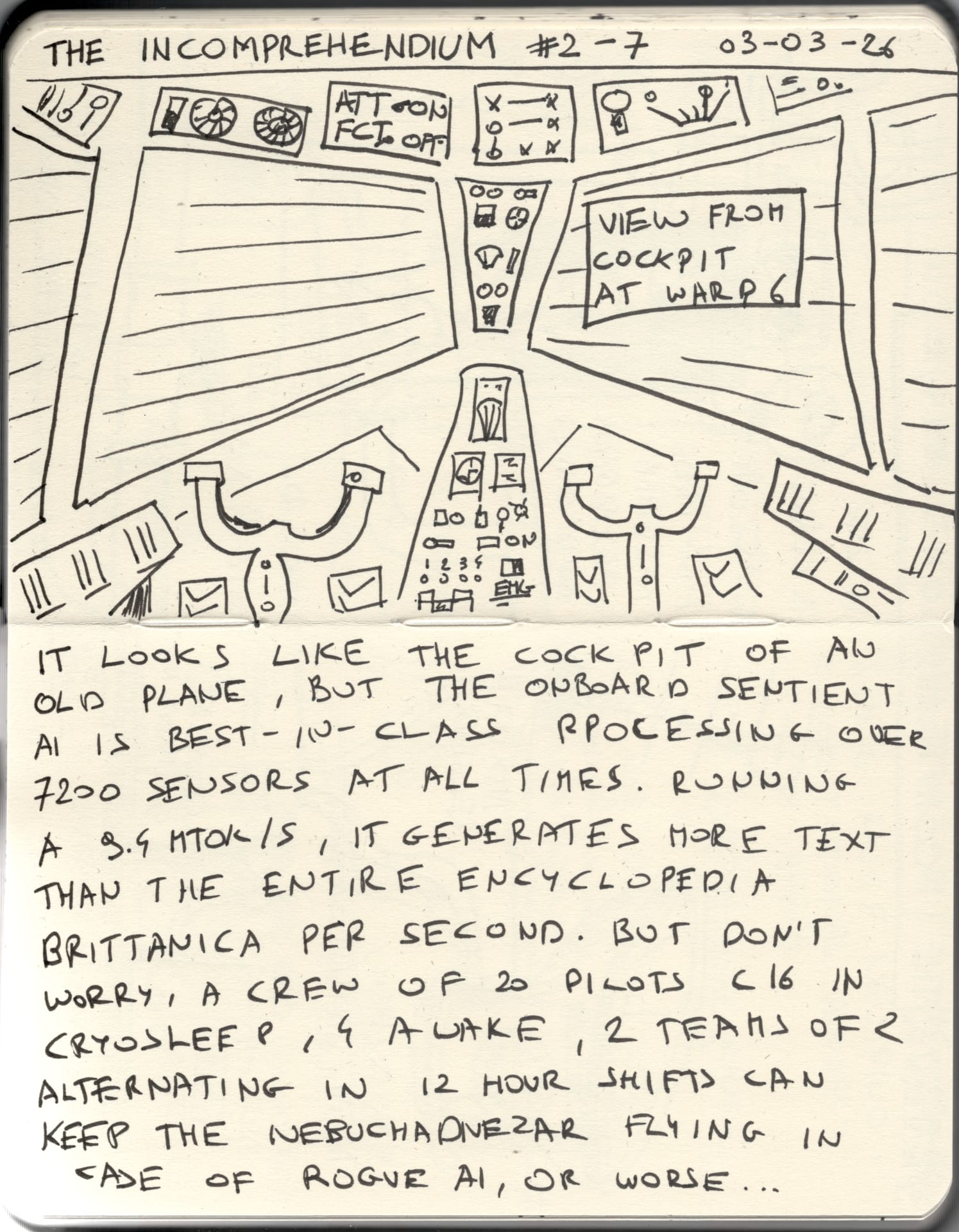 Page 2 depicts the cockpit interior at warp factor 6. The accompanying text, written in the same hand as the diagrams, describes an onboard sentient AI system processing in excess of 7,200 simultaneous sensor inputs. The notation that a crew of twenty — sixteen in cryogenic suspension, four on rotating active duty — exists as a contingency against rogue AI behavior is presented without apparent irony.