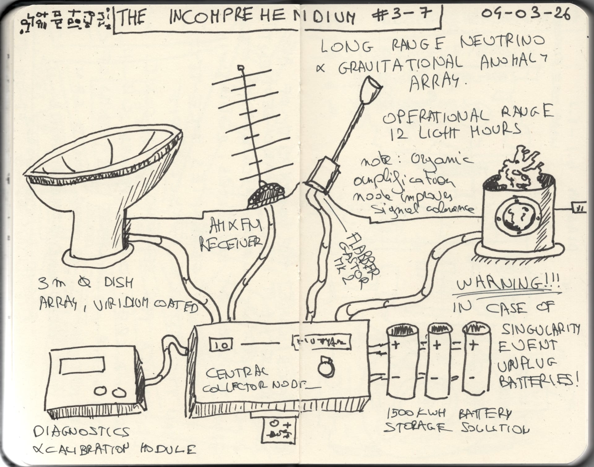Page 3 details the long-range neutrino and gravitational anomaly array, operational to a radius of twelve light hours. A marginal annotation advises that in the event of a singularity occurrence, batteries are to be disconnected. The instruction is underlined once.