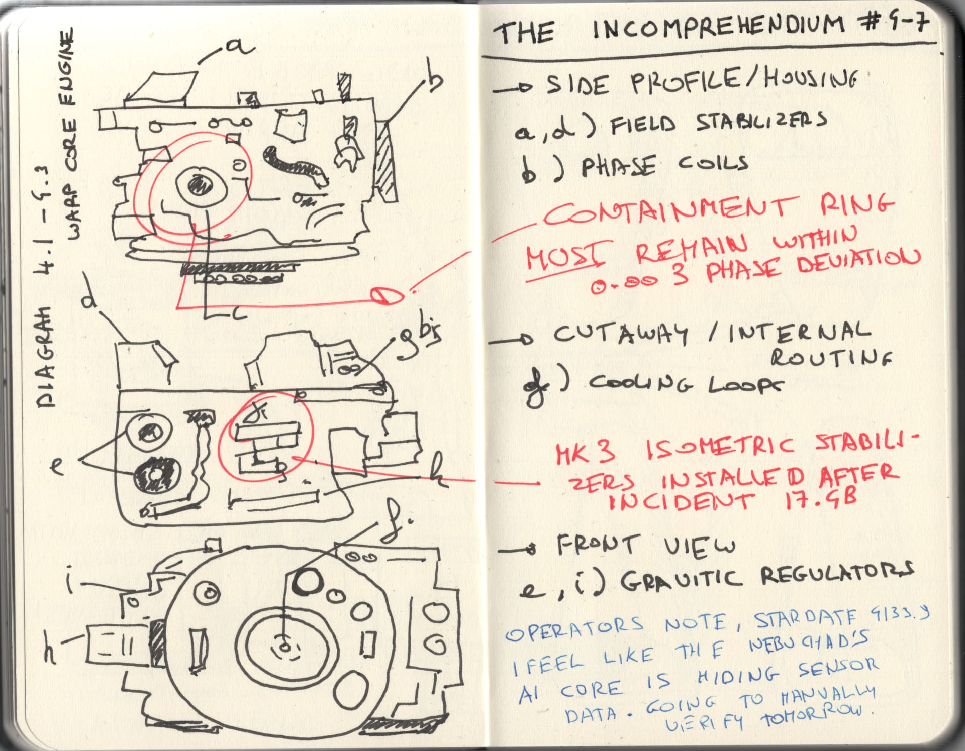 Page 4 marks a formal and affective departure. Red ink appears here for the first time in the sequence. Superimposed upon technical cross-sections of the warp core engine — field stabilizers, phase coils, cooling loops, gravitic regulators — is a handwritten operator note, attributed to stardate 4133.9: I feel like the Nebuchad's AI core is hiding sensor data. Going to manually verify tomorrow. The MK3 isometric stabilizers are noted as having been installed following Incident 17.9B. No further documentation of that incident is held by this institution.