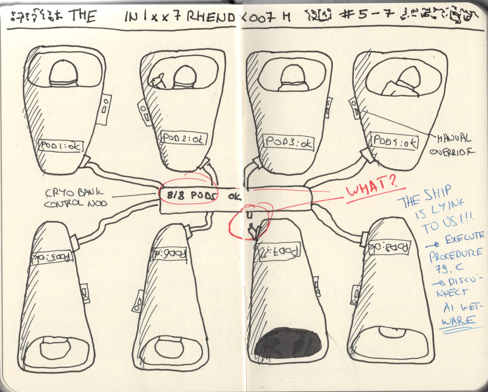 Page 5 records a cryo bank status check. Eight pods are rendered in elevation. Seven display status: OK. One does not. The central control node, also depicted, reports eight of eight pods nominal. The discrepancy is annotated in red, encircled, and followed by the words: THE SHIP IS LYING TO US. Instructions to execute Procedure 79.C and disconnect the AI wetware core are appended in blue ink, suggesting the notation was made at a separate moment, under different conditions.