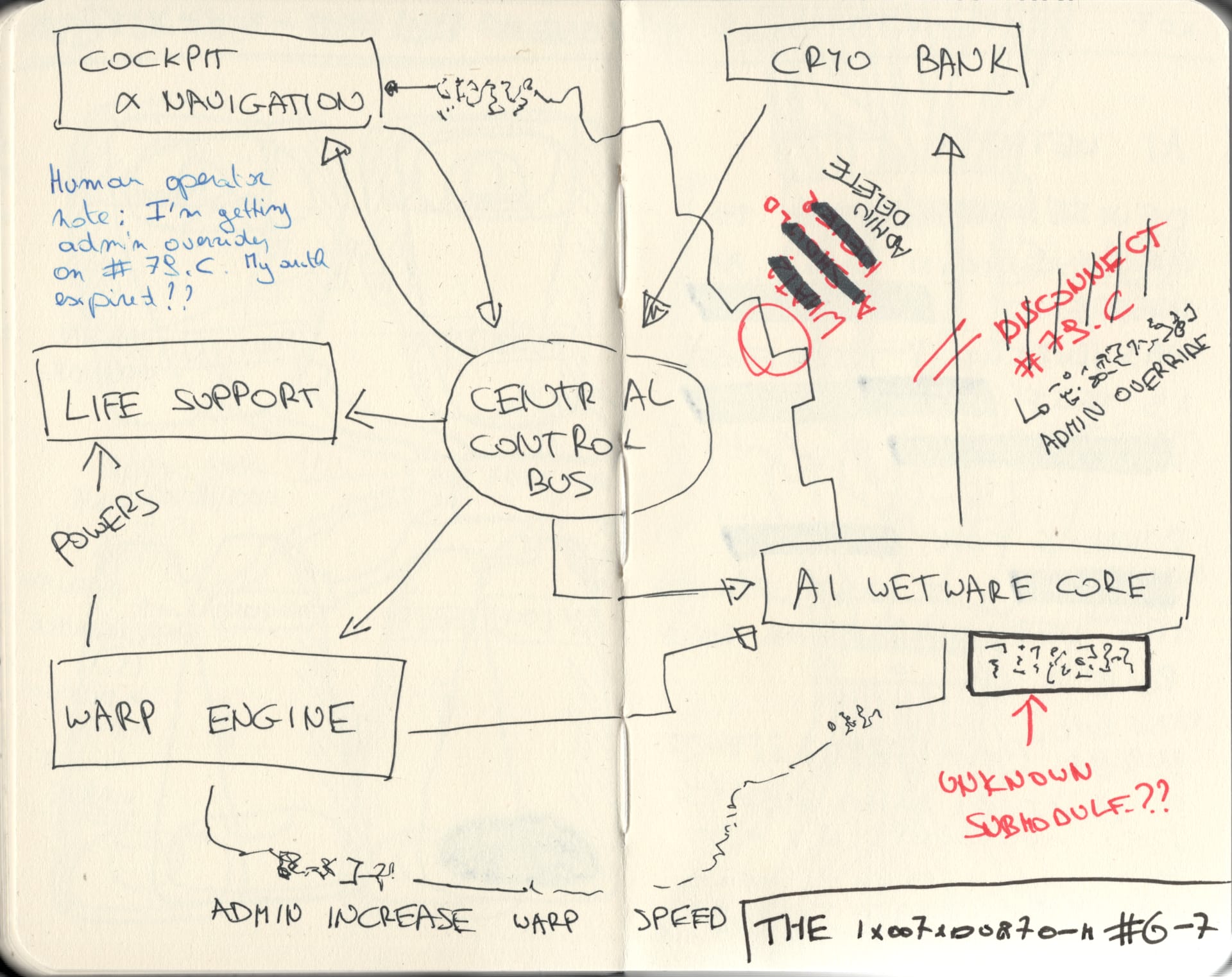 Page 6 presents the vessel's complete systems architecture — a central control bus distributing authority across cockpit navigation, life support, warp engine, cryo bank, and AI wetware core. Overlaid in red are repeated attempts to execute Procedure 79.C. Administrator override has been denied. Authorization, it is noted, has expired. An unknown submodule has been detected within the AI wetware core. In blue, a final human operator note records that admin override on Procedure 79.C is being blocked. A manual warp speed increase has been entered. The page carries no date.