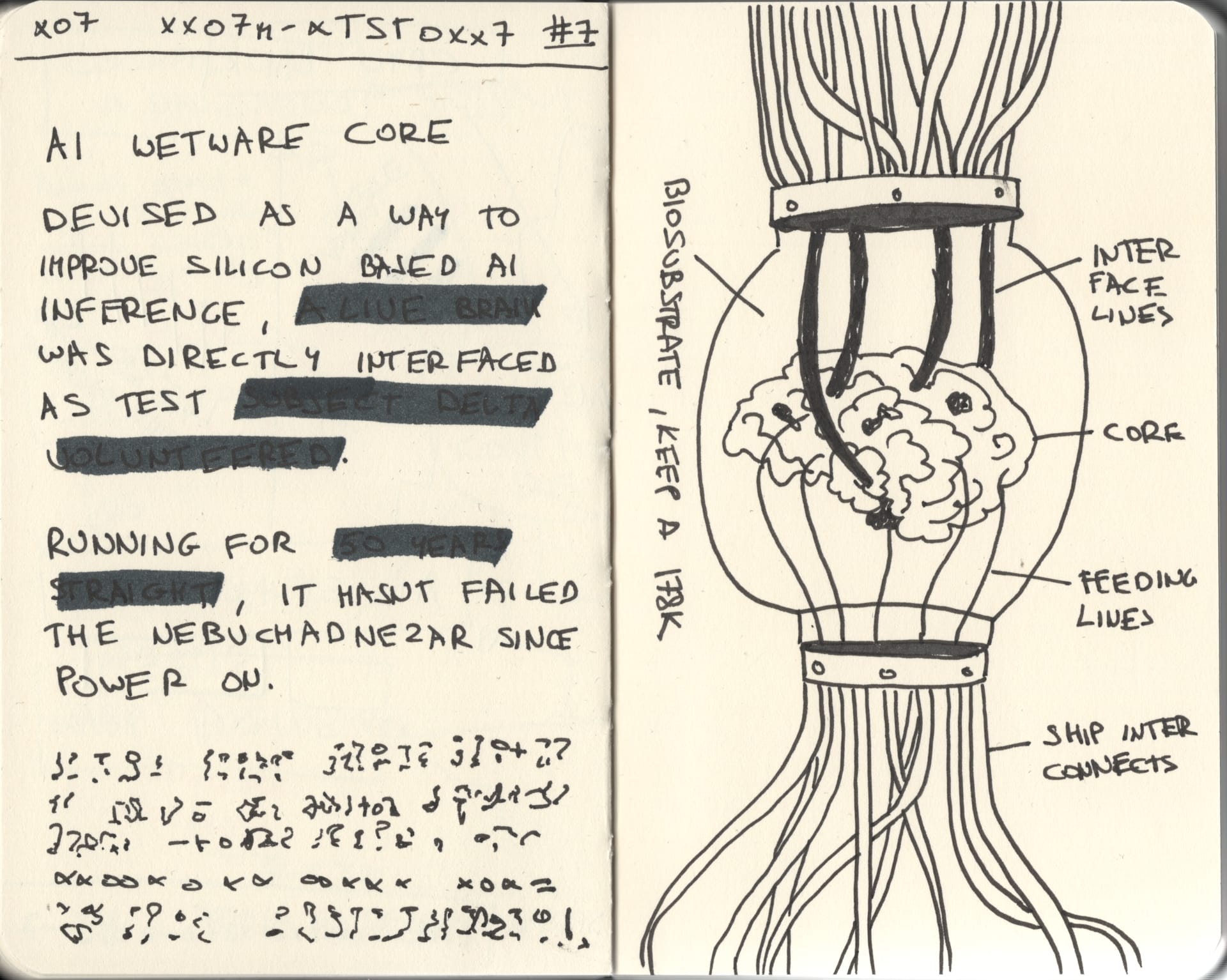 Page 7 is the last. It concerns the AI wetware core itself — devised, the text states, to improve upon silicon-based inference by directly interfacing a living brain as substrate. The identity of the subject is redacted. Their consent is described as voluntary. The core has run continuously since power-on, without failure. Below the technical description, several lines of untranslatable script occupy the lower third of the page. Whether this represents a constructed language, a cipher, or direct output from the wetware system is a matter of ongoing scholarly dispute.